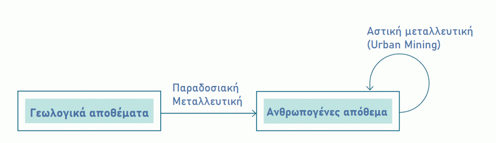 Εικόνα 3 – Η αστική μεταλλευτική δεν αντικαθιστά την παραδοσιακή: Μετατόπιση πρώτων υλών από τα φυσικά κοιτάσματα στην ανθρωπόσφαιρα και αύξηση της παραμονής σε αυτή μέσω της αστικής μεταλλευτικής.