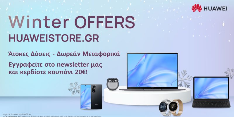 Αλλά οι ευκαιρίες δεν τελειώνουν εδώ, διότι πέραν των εκπτώσεων, η Huawei δωρίζει voucher της τάξης των 20 ευρώ σε όσους εγγραφούν στο newsletter της έως 30 Ιανουαρίου. Δεν έχετε παρά να επισκεφτείτε το ηλεκτρονικό κατάστημα, Ηuaweistore.gr, και να συμπληρώσετε το email σας στο σχετικό πεδίο, βγαίνοντας έτσι διπλά κερδισμένος: και θα μαθαίνετε έγκαιρα τα νέα της αγαπημένης σας εταιρείας και θα έχετε επιπλέον χρηματικό όφελος στην επόμενη ηλεκτρονική αγορά σας.