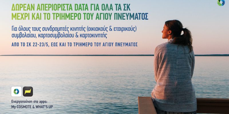 Δωρεάν απεριόριστα data για όλα τα Σαββατοκύριακα από τις 22/5, έως και το τριήμερο του Αγίου Πνεύματος (21/6), προσφέρει η Cosmote σε όλους τους συνδρομητές της, για να επικοινωνούν και να ψυχαγωγούνται ξέγνοιαστα από όπου και αν βρίσκονται.