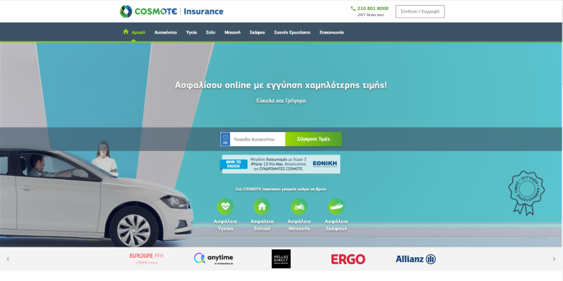 Τρία χρόνια τώρα, το COSMOTE Insurance απαντάει σε αυτήν τη σύγχρονη ανάγκη των καταναλωτών, παρέχοντας σε όλους τη δυνατότητα να βρουν το πρόγραμμα ασφάλισης που τους ταιριάζει, συγκρίνοντας και επιλέγοντας ανάμεσα σε πολλά διαθέσιμα ασφαλιστικά προγράμματα οχήματος, κατοικίας, πρωτοβάθμιας υγείας, ακόμα και σκάφους. Άλλωστε, στην ασφαλιστική πλατφόρμα της COSMOTE μπορείς να συγκρίνεις τα προγράμματα 16 κορυφαίων ασφαλιστικών brands όπως Interamerican, Anytime, ERGO, Ιnterlife, Εθνική Ασφαλιστική, Ατλαντική Ένωση, Αllianz, Hellas Direct, Eurolife FFH, Groupama, Ιντερσαλόνικα, Apeiron, ΕΛΠΑ και Mondial. Κατά συνέπεια σε ένα ενιαίο περιβάλλον οι χρήστες έχουν στη διάθεσή τους τις κορυφαίες ασφαλιστικές προτάσεις της ελληνικής αγοράς.