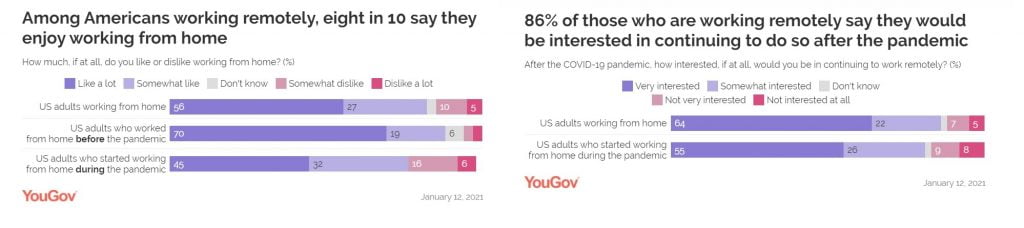 Όμως η πανδημία δεν άλλαξε μόνο την κουλτούρα των επιχειρήσεων, που είναι πλέον πιο δεκτικές στην τηλεργασία (τόσο ώστε ονόματα όπως η Microsoft το προηγούμενο Φθινόπωρο να προσφέρει την ευχέρεια μόνιμης εργασίας από το σπίτι σε ομάδες εργαζομένων της) αλλά και η πλειοψηφία των εργαζόμενων προτιμούν αυτό το μοντέλο εργασίας. Ενδεικτική είναι η έκθεση του YouGov (Ιανουάριος 2021), επίσης για την αμερικανική αγορά εργασίας.
