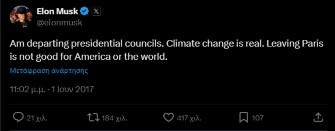 Πάμε στο 2017, για την ακρίβεια στην 1η Ιουνίου 2017. Ο Trump έχει συμπληρώσει περίπου έξι μήνες στον Λευκό Οίκο και αποφασίζει την απόσυρση των ΗΠΑ από τη Συμφωνία του Παρισιού για το κλίμα. Ο Musk, που μετέχει σε δύο επιτροπές που έχει συστήσει ο Trump, παραιτείται.