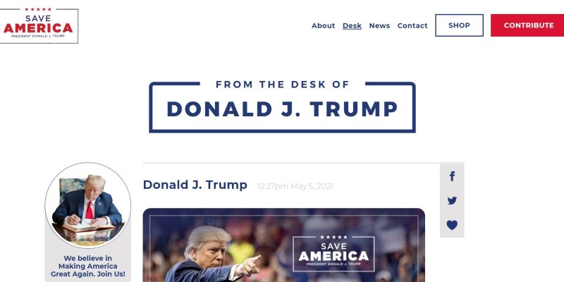 Η πλατφόρμα τελικά που επιλέχθηκε είναι ένα website με τίτλο “From the desk of Donald J. Trump”, που λειτουργεί ως πλατφόρμα διαμοιρασμού των ανακοινώσεων και της δραστηριότητας του πρώην Προέδρου των ΗΠΑ. Η συμμετοχή των χρηστών περιλαμβάνει τη δυνατότητα ανάρτησης σχολίων αλλά και την επιλογή διαμοιρασμού στα γνωστά social media.