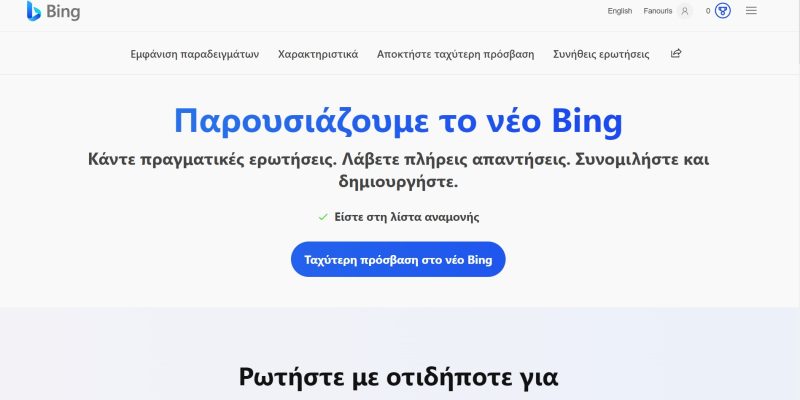 Πότε θα είναι διαθέσιμη η νέα έκδοση; Ήδη από χθες ένας περιορισμένος αριθμός χρηστών μπορεί να τη χρησιμοποιήσει. Αν ενδιαφέρεστε να είστε και εσείς ανάμεσα στους πρώτους που θα πάρουν τη νέα εμπειρία της Bing, μπορείτε να μπείτε σ’ αυτή τη σελίδα της Microsoft (https://binged.it/3XgB5sK), εκδηλώνοντας το ενδιαφέρον σας για να μπείτε στη λίστα αναμονής. Αρκεί να περάσετε το λογαριασμό σας στη Microsoft (email με κατάληξη outook.com ή Hotmail.com κ.α.).