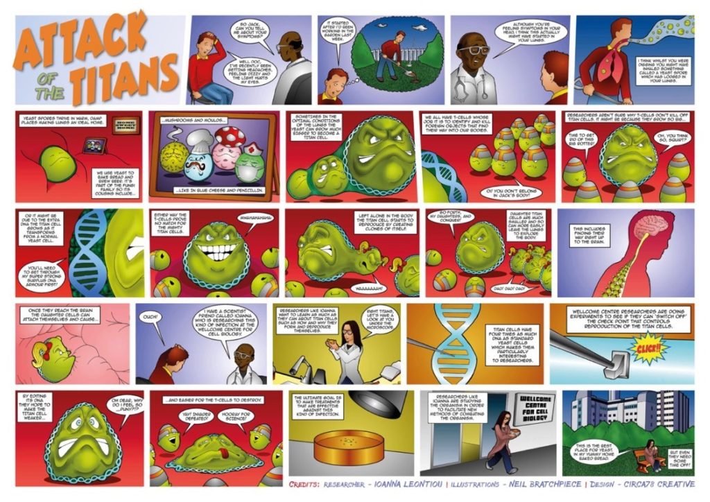 Στο Wellcome Trust Center of Cell Biology όπου και εργάζομαι, έχουμε σχηματίσει ομάδα που ειδικεύεται στην επικοινωνία της έρευνας μέσω δράσεων, καινοτόμων, διαδραστικών και ψυχαγωγικών. Και φυσικά προέκυψαν τα κόμικ, γιατί σκεφτήκαμε ότι μπορούν να είναι, εκτός από δική μου αγάπη, ένα αποτελεσματικό μέσο για την εξοικείωση μικρών και μεγάλων με τον επιστημονικό τρόπο σκέψης και την επιστημονική μεθοδολογία και να τραβήξουν το ενδιαφέρον. Κατά τη διάρκεια της πανδημίας μαζί με την Dr.Sarah-Jane Judge γράψαμε μια ιστορία βασισμένη στην έρευνά μου, η οποία μετατράπηκε σε κόμικ από τον κομίστα Neil Bratchpiece. Και ναι, διάφορα και κύτταρα είναι ζωγραφισμένα ως καρτούν. Και ναι συνάδελφοι επιστήμονες έγιναν καρτούν και εγώ έγινα χαρακτήρας κόμικ.
