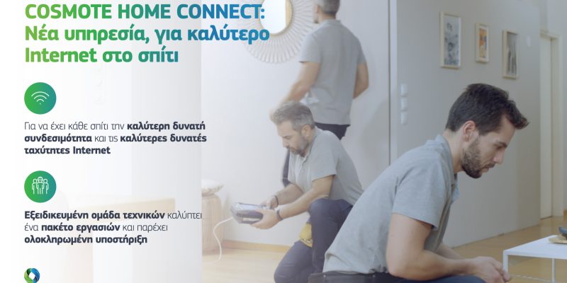 Τη νέα, αποκλειστική υπηρεσία Home Connect λάνσαρε η Cosmote με την οποία κάθε σπίτι μπορεί να απολαμβάνει το μέγιστο των δυνατοτήτων της συνδεσιμότητάς του και τις καλύτερες δυνατές ταχύτητες Internet. Η αποκλειστική υπηρεσία της Cosmote, μέσω εξειδικευμένης ομάδας τεχνικών, καλύπτει ένα πακέτο τεχνολογικών εργασιών και παρέχει ολοκληρωμένη υποστήριξη, προσαρμοσμένη στις ιδιαίτερες ανάγκες κάθε σπιτιού, ώστε να βοηθήσει τους συνδρομητές να βελτιώσουν τις υποδομές εντός του κτιρίου τους.