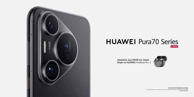Το Huawei Pura 70 Pro είναι διαθέσιμο στην ελληνική αγορά μέσω του δικτύου καταστημάτων των επίσημων συνεργατών της Huawei, με δώρο τα ασύρματα ακουστικά Huawei FreeBuds Pro 3, έως και τις 9 Ιουνίου ή μέχρι εξαντλήσεως των αποθεμάτων.