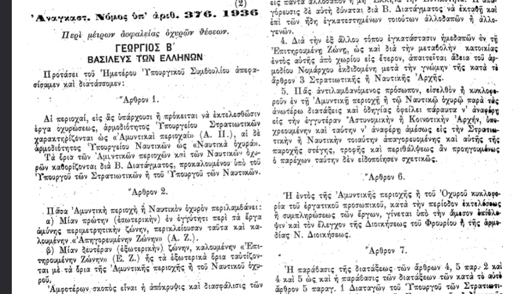 Ενενήντα χρόνια πίσω, το μεταξικό καθεστώς της 4ης Αυγούστου θεσπίζει τις Επιτηρούμενες Ζώνες και καθιερώνει ειδικά μέτρα σε αυτές με τον Αναγκαστικό Νόμο 376 του 1936. Επρόκειτο για μια ζώνη πλάτους έως και 45 χιλιομέτρων που ακολουθούσε τη χάραξη των βορείων συνόρων της χώρας και περιλάμβανε περιορισμούς στις μετακινήσεις και την οικονομική δραστηριότητας. Η ζώνη αυτή επιβίωσε του Β’ Παγκοσμίου Πολέμου και παρέμεινε εν ισχύ μέχρι την αποκατάσταση της Δημοκρατίας το 1974 όταν και ξεκίνησε η κατάργησή της.
