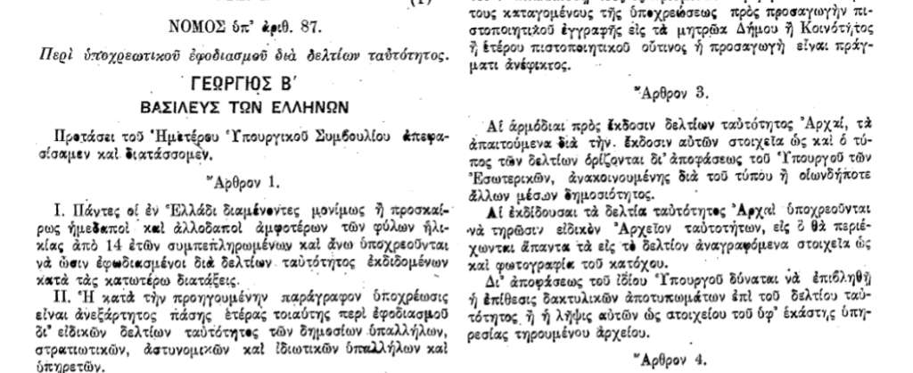 Λίγο μετά, τον Ιανουάριο του 1945, κάθε πολίτης, Έλληνας ή ξένος, ηλικίας άνω των 14 ετών, οφείλει να εφοδιαστεί με δελτίο ταυτότητας, στο οποίο περιλαμβάνονται τα γνωστά στοιχεία ονοματεπώνυμο, ονόματα γονέων, ημερομηνία και τόπος γέννησης κ.τ.λ.), το θρήσκευμα και το επάγγελμα.