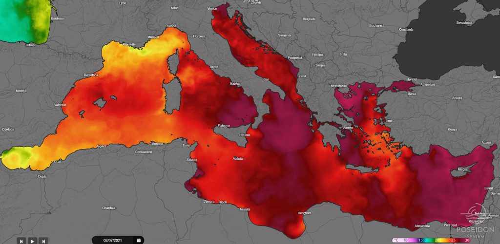 Επιφανειακή θερμοκρασία της θάλασσας στην περιοχή της Μεσογείου στις 2 Ιουλίου 2021, όπως υπολογίστηκε από βραδινές λήψεις υπέρυθρων αισθητήρων από διαφορετικούς δορυφόρους. Πηγή: Σύστημα Ποσειδών