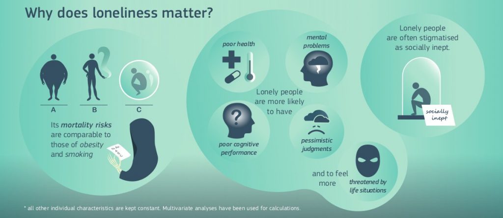 Στην Ευρώπη, η έκθεση του Κοινού Κέντρου Ερευνών που δημοσιεύθηκε τον Ιούλιο του 2021, κατέγραψε την καταστροφική επίδραση της πανδημίας στην ψυχική υγεία των πολιτών της Ε.Ε. Οι δείκτες της μοναξιάς διπλασιάστηκαν στον γενικό πληθυσμό της Ένωσης και τετραπλασιάστηκαν στις ηλικίες 18-25. Η Αντιπρόεδρος της Κομισιόν για θέματα Δημοκρατίας και Δημογραφίας, Ντούμπραβκα Σούιτσα, κατά την παρουσίαση των συμπερασμάτων της έκθεσης, παραδέχτηκε ότι η πανδημία έφερε στο προσκήνιο -και επιδείνωσε- προβλήματα που προϋπήρχαν: «Το αίσθημα της μοναξιάς και η κοινωνική απομόνωση υπήρχαν από πριν, αλλά η επίγνωση και η ευαισθησία μας γι’ αυτά ήταν περιορισμένη». Σύμφωνα με την ίδια έκθεση, οι αναφορές στο φαινόμενο της μοναξιάς διπλασιάστηκαν μεσοσταθμικά στα online media των κρατών της Ε.Ε. αλλά η ευαισθητοποίηση σχετικά με το θέμα διαφέρει σημαντικά από κράτος σε κράτος. Κάποιοι ασχολούνται, κάποιοι όχι.