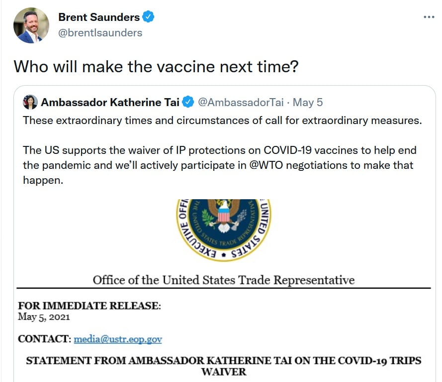 Όπως επισημαίνουν αρκετοί ειδικοί, εφόσον δεν υπήρχαν καν οι πατέντες των εμβολίων –όπως μαξιμαλιστικά ζητούν ορισμένοι– θα ήταν πρακτικά ασύμφορο για μια φαρμακοβιομηχανία ακόμη και να μπει στη χρονοβόρα και πολυδάπανη διαδικασία έρευνας ενός εμβολίου που θα μπορούν να αντιγράψουν οι ανταγωνιστές της, σχεδόν αμέσως μετά την εμπορική κυκλοφορία του.