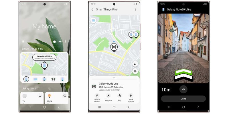 Ο εντοπισμός της συσκευής γίνεται ακόμα πιο γρήγορα, με ενσωματωμένους χάρτες και την δυνατότητα παραγωγής χαρακτηριστικού ήχου από τη συσκευή. Ο χρήστης μπορεί να ενεργοποιήσει την υπηρεσία SmartThings Find στο smartphone ή το tablet του, και στη συνέχεια να επιλέξει τη συσκευή που θέλει να εντοπίσει. Στη συνέχεια, το smartphone θα του δείξει την ακριβή τοποθεσία της συσκευής στο χάρτη. Μόλις πλησιάσει σε αυτήν, ο χρήστης μπορεί να επιλέξει είτε να «κουδουνίσει» η συσκευή ή να την εντοπίσει μέσω της AR λειτουργίας Search Nearby, που εμφανίζει έγχρωμα γραφικά, των οποίων η ένταση αυξάνεται όταν πλησιάζει στη συσκευή.