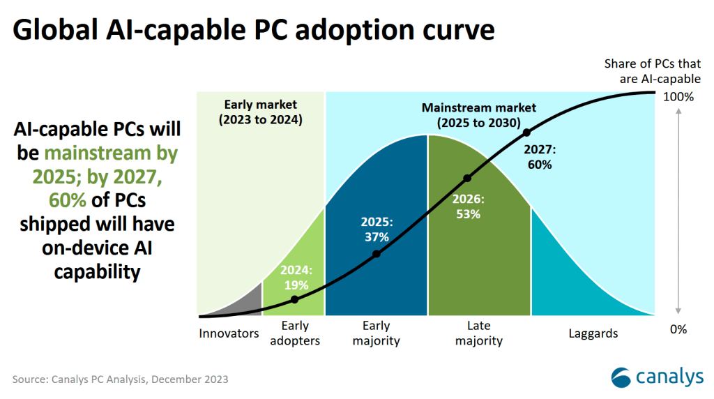 Η είσοδος της τεχνητής νοημοσύνης στα PCs αναμένεται να προσδώσει και μια νέα δυναμική στην αγορά. Άνθρωποι της αγοράς εκτιμούν ότι όλα τα segments της αγοράς θα δουν θετικούς ρυθμούς στις πωλήσεις, τόσο σε τεμάχια όσο και σε έσοδα. Ενδεικτική είναι η πρόβλεψη της IDC που κάνει λόγο για αύξηση 2% των πωλήσεων μέσα στο 2024 και ένα μέσο ρυθμό αύξησης 2,4% για το διάστημα 2024-2028. Από την άλλη πλευρά, η Canalys εκτιμά ότι μέχρι το 2027 τα AI PCs θα αντιστοιχούν στο 60% του συνόλου της αγοράς των PCs.