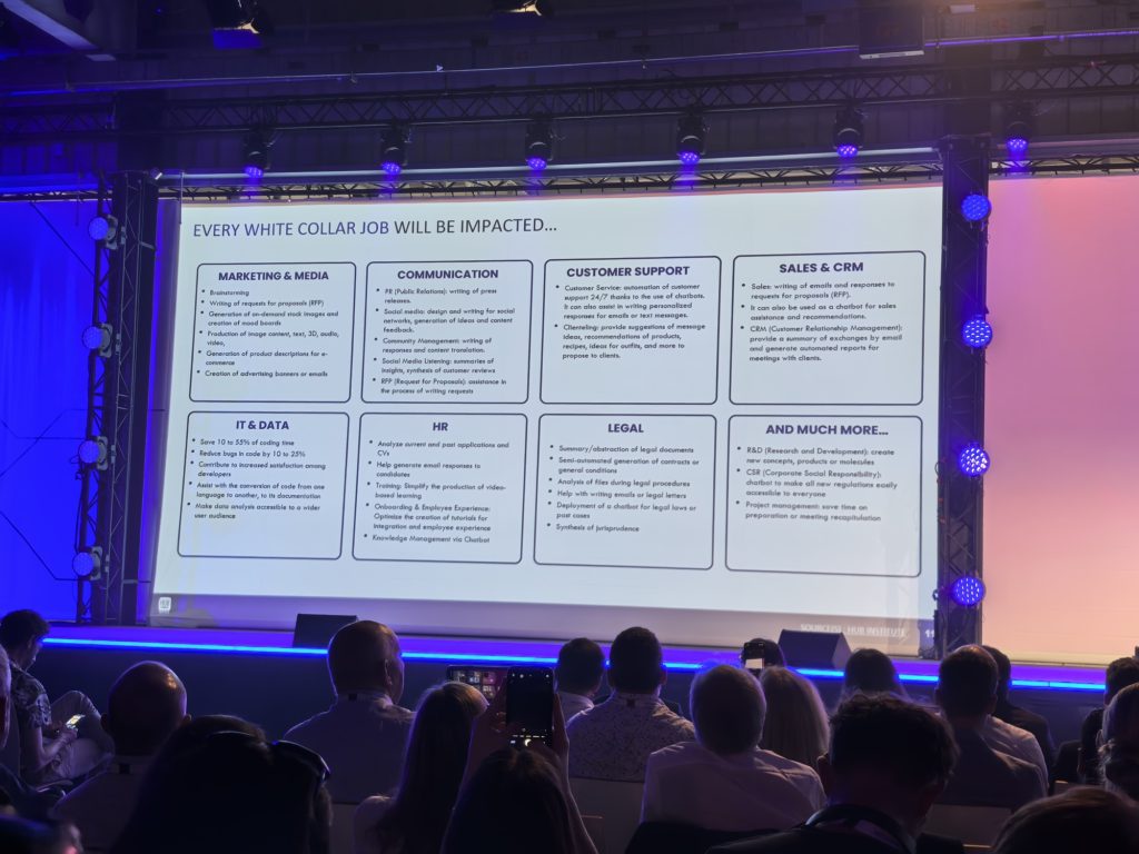 - David Shrier (Futurist, Innovation Catalyst & VC), ο οποίος μίλησε για τις τεράστιες ευκαιρίες που δημιουργεί η τεχνητή νοημοσύνη, αλλά και τις σημαντικές προκλήσεις που φέρνει μαζί της. Ο κ. Shrier στάθηκε μεταξύ άλλων στις τεράστιες απαιτήσεις ενέργειας που έχει η τεχνητή νοημοσύνη, αναφέροντας μεταξύ άλλων ότι η εκπαίδευση ενός τέτοιου συστήματος απαιτεί ισόποση ενέργεια με εκείνη που καταναλώνουν 30.000 νοικοκυριά, ενώ η δημιουργία μίας φωτογραφίας βάσει περιγραφής από ένα ΑΙ σύστημα καταναλώνει αντίστοιχη ενέργεια με εκείνη ενός iPhone στη διάρκεια μιας ημέρας.