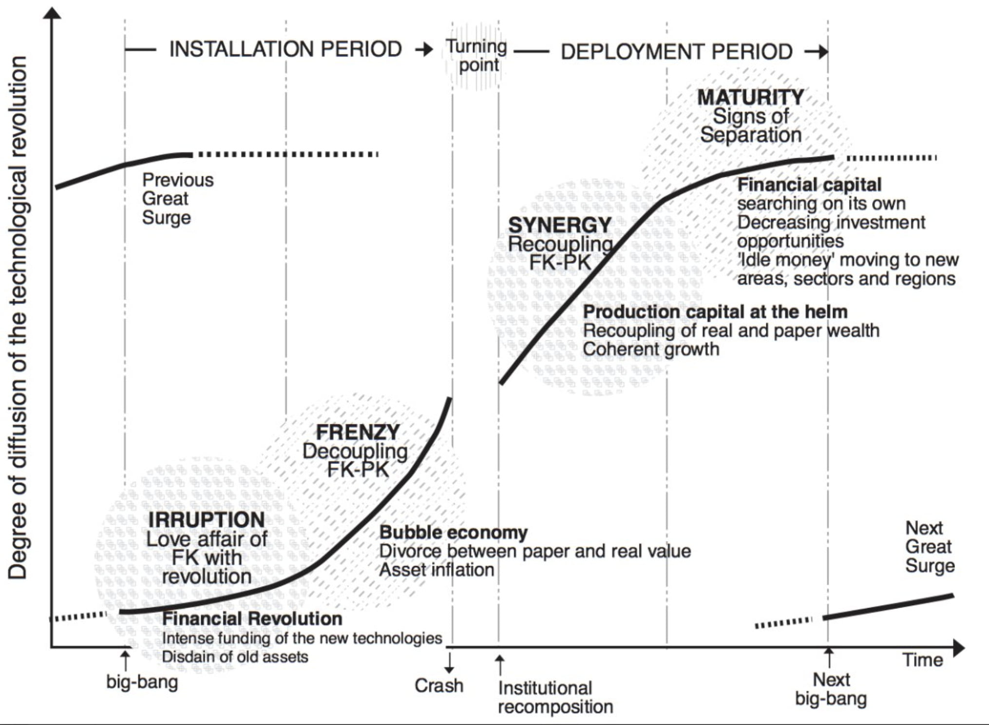 Τι είναι αυτό που σηματοδοτεί μια νέα εποχή; Είναι ένας συνδυασμός παραγόντων που πρέπει να συμβούν: μια νέα εφεύρεση, μια αλλαγή σε επίπεδο υποδομών η οποία σταδιακά γίνεται οικονομικά συμφέρουσα ώστε να εξαπλωθεί μαζικά, μια σειρά από άλλες εφευρέσεις που συνδέονται και δημιουργούν ένα τεχνολογικό σύστημα. Ακολουθεί μια περίοδος οικονομικού φιλελευθερισμού (laissez-faire), μία ή περισσότερες “φούσκες” και στη συνέχεια κρίσεις. Αρχίζει να οικοδομείται κανονιστικό πλαίσιο και ρυθμιστικές αρχές, η τεχνολογία γίνεται προσβάσιμη σε όλους, μειώνονται οι ανισότητες, και τέλος απολαμβάνει μαζική εξάπλωση σε μια περίοδο ενσωμάτωσης. Συνήθως, το δεύτερο μισό κάθε τεχνολογικής εποχής είναι μια περίοδος πιο “ήσυχη”, κατά τη διάρκεια της οποίας οι επαναστατικές τεχνολογίες του πρώτου μισού ενσωματώνονται πραγματικά στην καθημερινότητα της ανθρωπότητας και την ωφελούν.