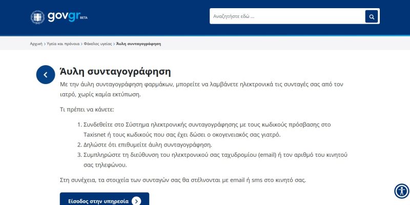 Τη δυνατότητα να λαμβάνουν τις ιατρικές τους συνταγές στο κινητό τους, χωρίς να χρειάζεται να τις προσκομίζουν τυπωμένες στον φαρμακοποιό έχουν από σήμερα οι πολίτες, καθώς τίθεται σε δοκιμαστική λειτουργία η εφαρμογή για την άυλη συνταγογράφηση μέσω του gov.gr. Πρόκειται για κοινή πρωτοβουλία των Υπουργείων Ψηφιακής Διακυβέρνησης και Υγείας, μέσω της οποίας μια ιδιαίτερα σημαντική και ευαίσθητη διαδικασία γίνεται απλούστερη για όλους τους εμπλεκόμενους (πολίτες, γιατρούς, φαρμακοποιούς) εξασφαλίζοντας ταυτόχρονα ασφάλεια, διαφάνεια και ιδιωτικότητα σε όλα τα επιμέρους στάδια. Καθιερώνεται, επιπλέον, η εξ αποστάσεως συνταγογράφηση για περιπτώσεις επαναλαμβανόμενων συνταγών που αφορούν χρόνιες παθήσεις, απαλλάσσοντας τις ευαίσθητες ομάδες του πληθυσμού από την ανάγκη αυτοπρόσωπης παρουσίας στο ιατρείο.